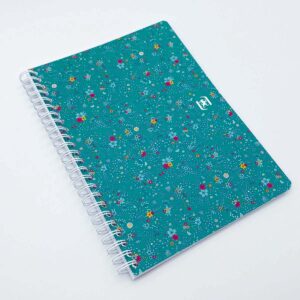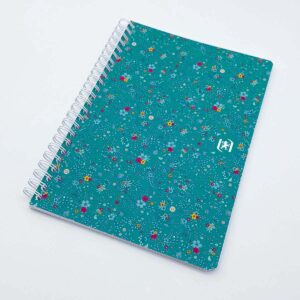 Oxford spiraalblok of notebook Aqua in A5 formaat. Het vrolijke notitieboek is gelinieerd en heeft een stevige dubbele spiraal. Hij is 120 pagina’s dik (60 vel), met kantlijn en zachte kartonnen FLORAL kaft.