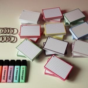 1000 flashcards in A7 formaat (10,5 bij 7,4 cm groot), gemaakt van dik, 300 grams papier.