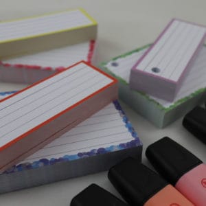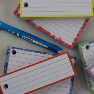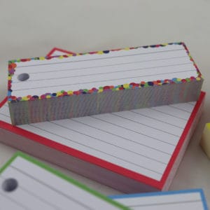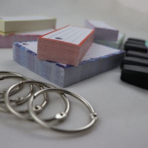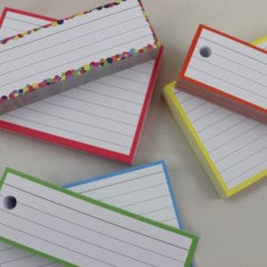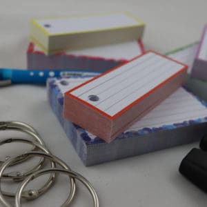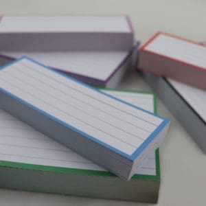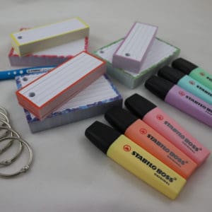 Je krijgt 6 pakjes flashcards in 2 formaten, van elke formaat 3 pakjes. Je kunt helemaal zelf bepalen hoe het pakketje eruit komt te zien, kies uit alle kleuren, gelinieerd, geruit en blanco.