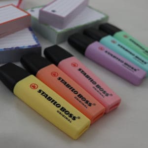 Markeer de hoofdstuknummers, titels en meer met deze hele fijne markers. In rustige pastelkleuren die uiteraard weer prima passen bij de kleuren van onze flashcards:-). Daarnaast kun je door de lichte kleuren altijd de tekst lezen die eronder zit. We zijn fan van specifiek deze omdat ze niet uitdrogen en niet vlekken met de fineliners. Ook weer voorzien van anti-uitdroog technologie tot wel vier uur. De puntbreedte is 2mm (smalle zijde) en 5mm (brede zijde).