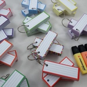 De 1500 halve flashcards worden voor je geperforeerd en je ontvangt 15 metalen klikringen van 40mm doorsnede. Elke ring kan 100 geperforeerde flashcards bij elkaar houden.
