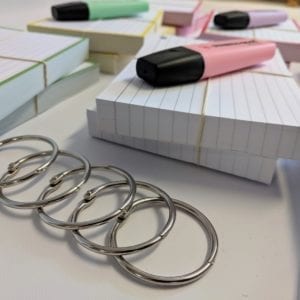 De 1000 flashcards worden voor je geperforeerd en je ontvangt 5 metalen klikringen van 40mm doorsnede. Elke ring kan 100 geperforeerde flashcards bij elkaar houden.