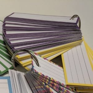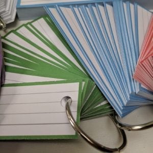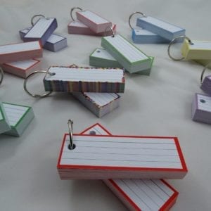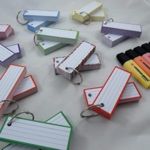 De 1000 halve flashcards worden voor je geperforeerd en je ontvangt 10 metalen klikringen van 40mm doorsnede. Elke ring kan 100 geperforeerde flashcards bij elkaar houden.