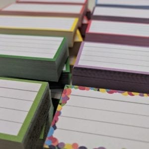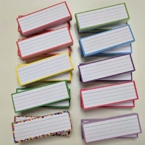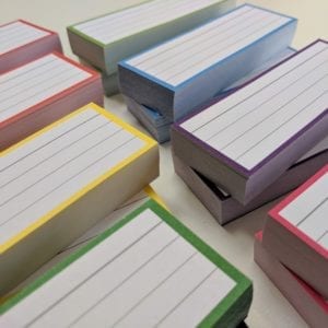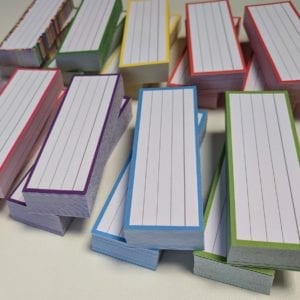1000 flashcards in half formaat (waaiers) van 3,5 bij 10,5 cm groot, gemaakt van dik, 300 grams papier.