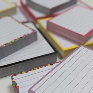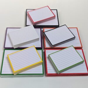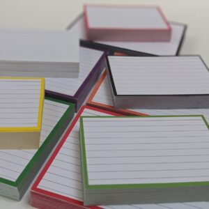 Je krijgt van elk formaat 5 pakjes, 10 pakjes in totaal. Je kunt helemaal zelf bepalen hoe het pakketje eruit komt te zien, kies uit alle kleuren, gelinieerd, geruit en blanco. Combineer met pennen, fineliners of markers en je hebt een leuk en persoonlijk flashcardspakket
