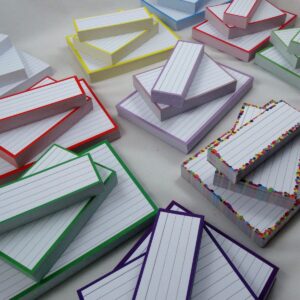 500 flashcards in half formaat (3,5 bij 10,5 cm groot), gemaakt van dik, 300 grams papier.