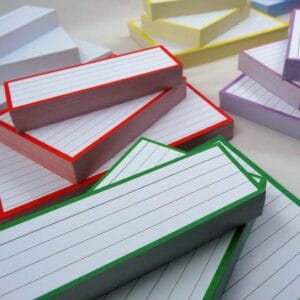 500 flashcards in A7 formaat (10,5 bij 7,4 cm groot), gemaakt van dik, 300 grams papier.