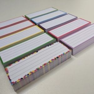 500 flashcards in half formaat (3,5 bij 10,5 cm groot), gemaakt van dik, 300 grams papier.