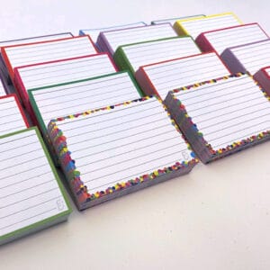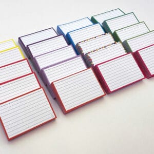 Flashcards pakket A7 formaat met daarin 1000 flashcards, verdeeld in 10 verschillende kleuren.