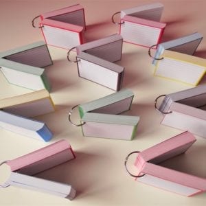 Flashcards pakket met daarin 1000 flashcards, verdeeld in 10 verschillende kleuren. Alle flashcards zijn geperforeerd en er worden 10 klikringen meegeleverd.