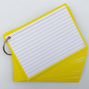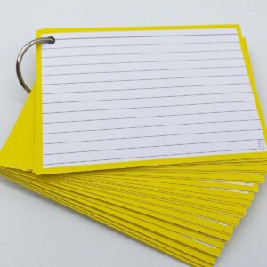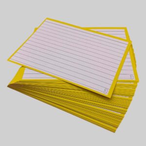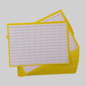 Gele Leitner flashcards A6 formaat, met een gele rand. Ze zijn 10 centimeter hoog en 15 centimeter breed (A6 formaat) en gemaakt van dik, 300 grams papier. Aan beide kanten gelinieerd met 14 lijntjes waarvan 1 titellijn. De kaartjes hebben grijze lijntjes en hebben een gele rand. De A6 Leitner flashcards zijn aan de voor-en achterzijde gelijk en geschikt als systeemkaartjes, leerkaartjes en steekkaartjes.