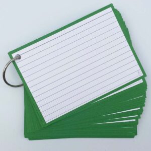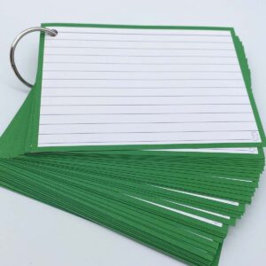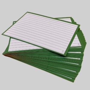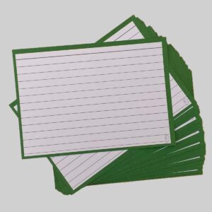 Groene Leitner flashcards A6 formaat, met een groene rand. Ze zijn 10 centimeter hoog en 15 centimeter breed (A6 formaat) en gemaakt van dik, 300 grams papier. Aan beide kanten gelinieerd met 14 lijntjes waarvan 1 titellijn. De Leitner flashcards hebben grijze lijntjes en zijn aan de voor-en achterzijde gelijk. Geschikt als systeemkaartjes, leerkaartjes en steekkaartjes.