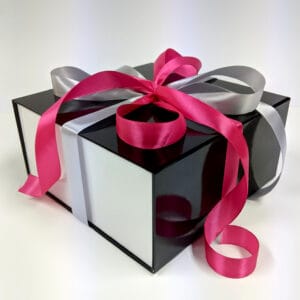 Luxe zwarte of zilveren bewaarbox of cadeaubox voor flashcards mét dubbele knalroze, blauwe, zilveren of rode strik. Kies zelf welke kleur je wilt. De box is superstevig en heeft een magneetsluiting. Als de box besteld wordt vullen wij hem alvast met de flashcards en accessoires die erbij zijn besteld.