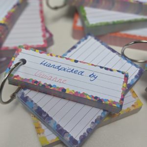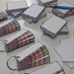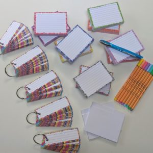 250 flashcards in half formaat (3,5 bij 10,5 cm groot), gemaakt van dik, 300 grams papier.