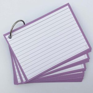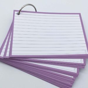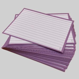 Lila Leitner flashcards A6 formaat, met een lila rand. Ze zijn 10 centimeter hoog en 15 centimeter breed (A6 formaat) en gemaakt van dik, 300 grams papier. Aan beide kanten gelinieerd met 14 lijntjes waarvan 1 titellijn. De lila Leitner flashcards hebben grijze lijnen en zijn aan de voor-en achterzijde gelijk. Geschikt als systeemkaartjes, leerkaartjes en steekkaartjes.
