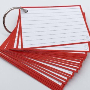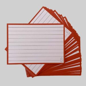 Oranje Leitner flashcards in A7 formaat, met een oranje rand. Gemaakt van dik, 300 grams papier, A7 formaat en aan beide kanten gelinieerd. De kaartjes hebben grijze lijntjes, een oranje rand en zijn aan de voor-en achterzijde gelijk. Hierdoor zijn deze Leitner flashcards ideaal als systeemkaartjes, leerkaartjes en steekkaartjes.