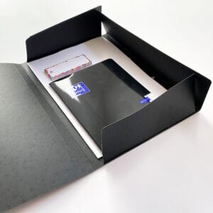 De mappen hebben een zelfklevend etiket en zijn superhandig in gebruik. Je kunt er tot 200 pagina’s in kwijt en door het stevige materiaal zijn ze slijt en scheurvast. De map heeft twee elastieken om hem dicht te houden, de rug van de map past zich aan aan de hoeveelheid papier die erin zit.