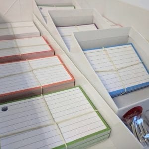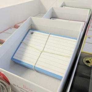 - De drie boxjes zijn gemaakt van hetzelfde materiaal en hebben een capaciteit van +/- 300 flashcards A7 formaat (6 pakjes)