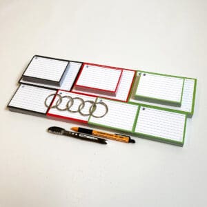 Optioneel: de 500 flashcards worden voor je geperforeerd en je ontvangt 5 metalen klikringen van 40mm doorsnede. Elke ring kan 100 geperforeerde flashcards bij elkaar houden.