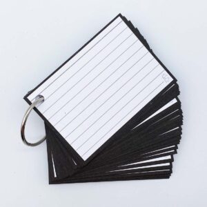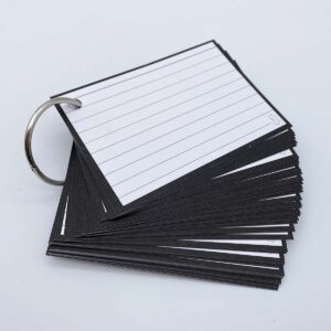 Zwarte flashcards A7 formaat, gelinieerd met een zwarte rand van Leitner®