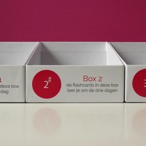 - Elk boxje heeft een eigen opdruk: 1, 2 en 3, inclusief toelichting, volgens het Leitner systeem.