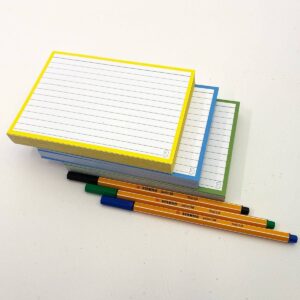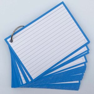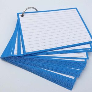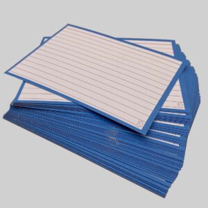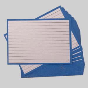 Blauwe Leitner flashcards A6 formaat, met een blauwe rand. Ze zijn 10 centimeter hoog en 15 centimeter breed (A6 formaat) en gemaakt van dik, 300 grams papier. Aan beide kanten gelinieerd met 14 lijntjes waarvan 1 titellijn. De Leitner flashcards zijn aan de voor-en achterzijde gelijk en zijn geschikt als systeemkaartjes, leerkaartjes en steekkaartjes.