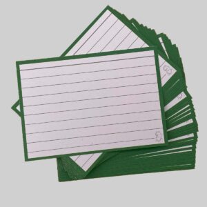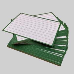 Groene Leitner flashcards in A7 formaat, met een groene rand. Gemaakt van dik, 300 grams papier, A7 formaat en aan beide kanten gelinieerd. De kaartjes hebben grijze lijntjes, een groene rand en zijn aan de voor-en achterzijde gelijk. Hierdoor zijn deze Leitner flashcards ideaal als systeemkaartjes, leerkaartjes en steekkaartjes.