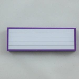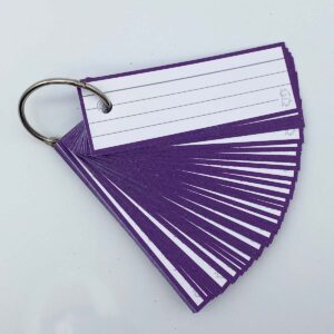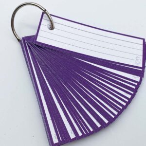 Flashcards Half Paars Gelinieerd van Leitner®. Halve flashcards gelinieerd met een paarse rand. Ze zijn 3,5 centimeter hoog en 10,5 centimeter breed en gemaakt van dik, 300 grams papier. Het is een compact formaat, de kaartjes zijn aan beide kanten gelijk en ze zijn voorzien van grijze lijntjes. Ideaal in gebruik als systeemkaartjes, leerkaartjes en steekkaartjes.