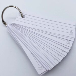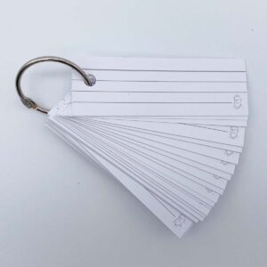 Flashcards in half formaat van Leitner. Ze zijn 3,5 bij 10,5 cm, gelinieerd wit, gemaakt van dik, 300 grams papier. De kaartjes hebben een witte rand, zijn gelinieerd en aan de voor-en achterzijde gelijk.