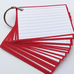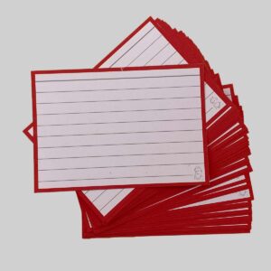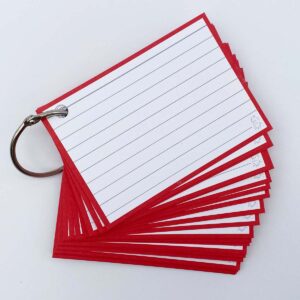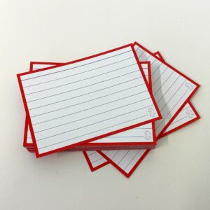 Rode flashcards in A7 formaat, gelinieerd met rode rand van Leitner®