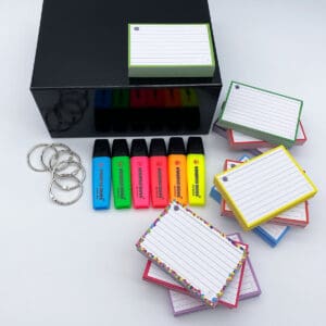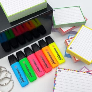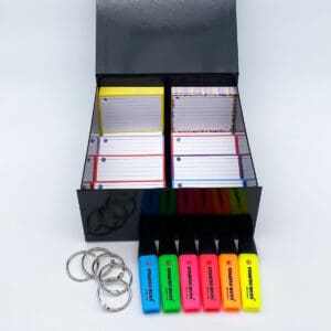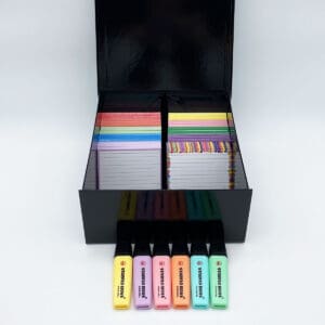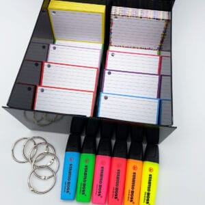 Het kant en klare kleurenpakket met 500 flashcards, perforatie van je flashcards, klikringen én de Stabilo Boss markers nu samen verpakt in de cadeaubox.