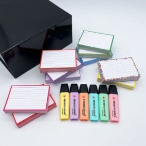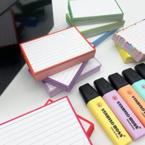 500 flashcards in A7 formaat (10,5 bij 7,4 cm groot), gemaakt van dik, 300 grams papier.