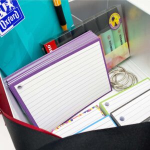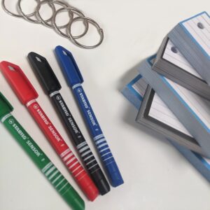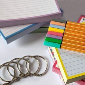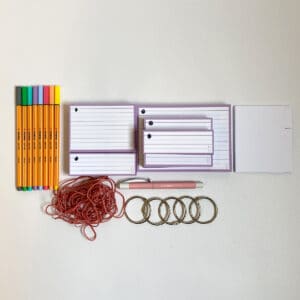 Optioneel: de 250 flashcards worden voor je geperforeerd en je ontvangt 5 metalen klikringen van 40mm doorsnede. Elke ring kan 100 geperforeerde flashcards bij elkaar houden.