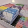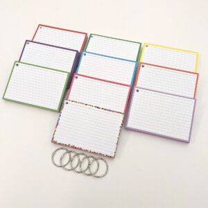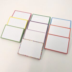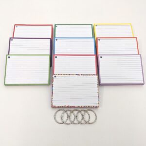 Pakket flashcards in A6 formaat met daarin 500 flashcards, verdeeld in 10 verschillende kleuren.